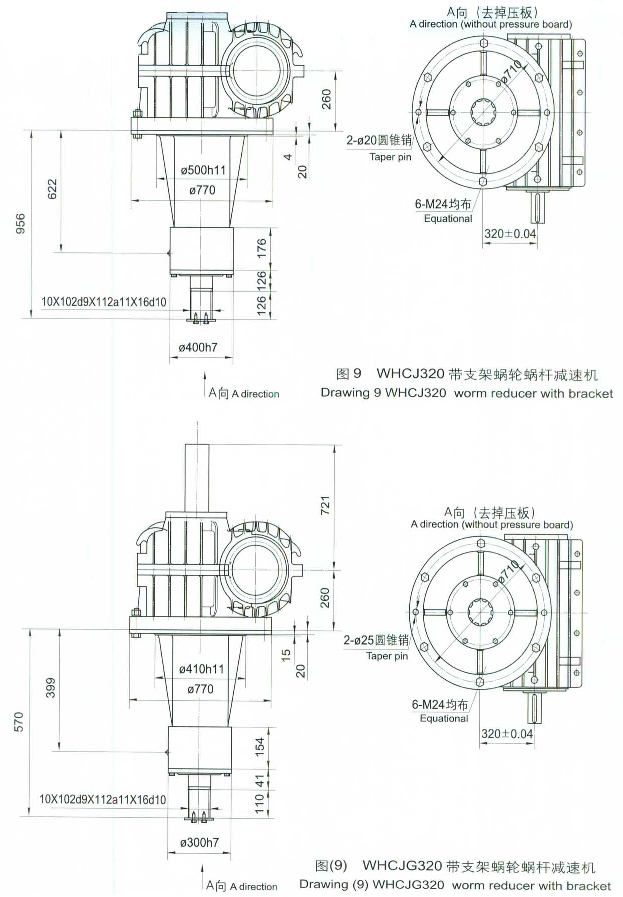 一、概述 WHCJ(帶支架型)、WHCJG(帶過載保護型),是在WHC產品基礎上的改進型港口專用減速機。外型尺寸見圖6一圖10。除圖中所示尺寸外,其余尺寸和速比均借用標準WHC系列,此減速機主要用于港口機械設備的減速傳動。